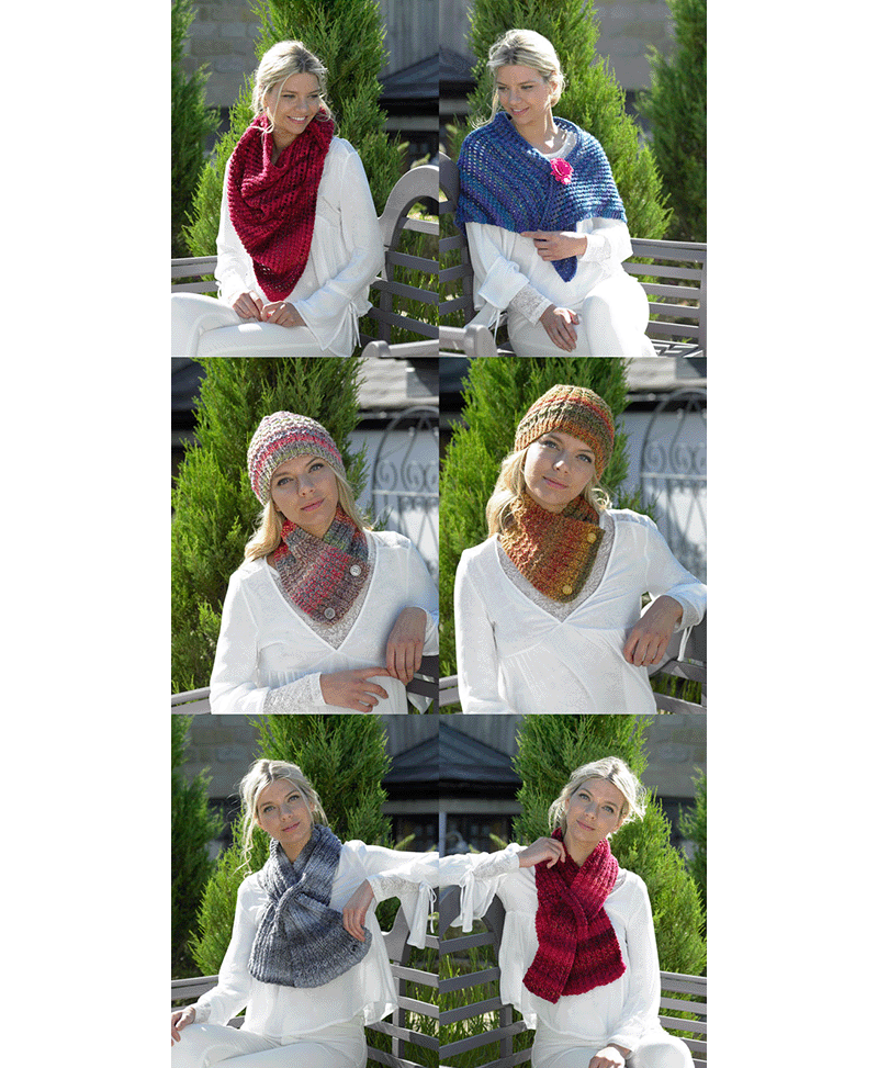 There are 4 designs to choose from, choose a button down scarf, hat, triangular shawl or thread through scarf.