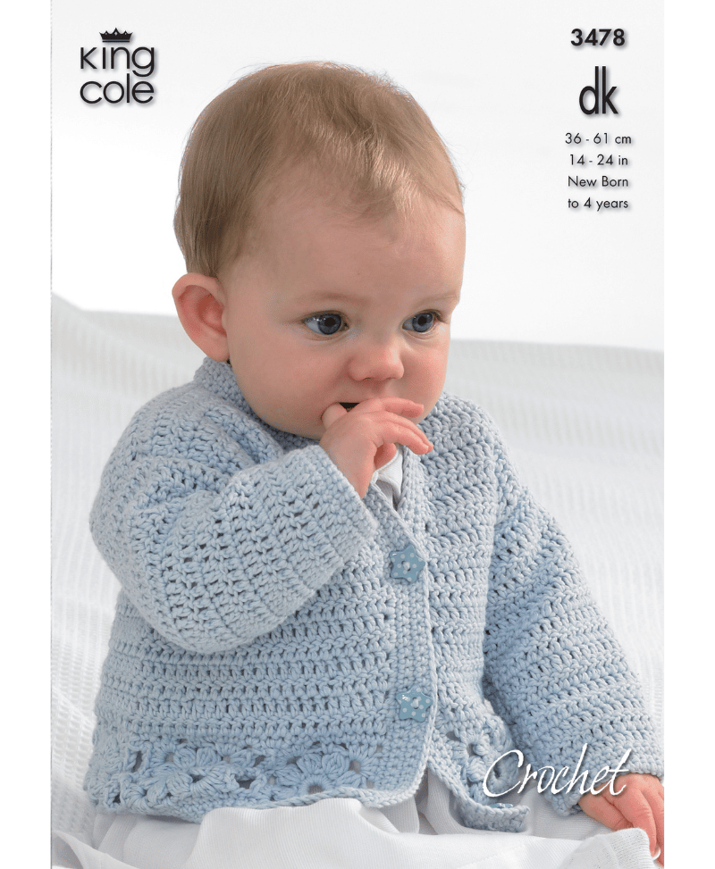 Choose from 4 easy to follow crochet patterns for your little one. There is a V-Neck cardigan, hooded gilet and a short or long sleeve sweater, all made in King Cole's Bamboo Cotton DK