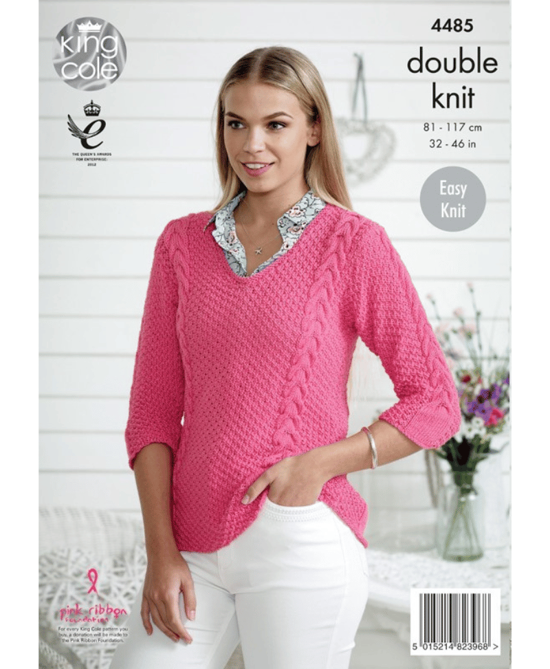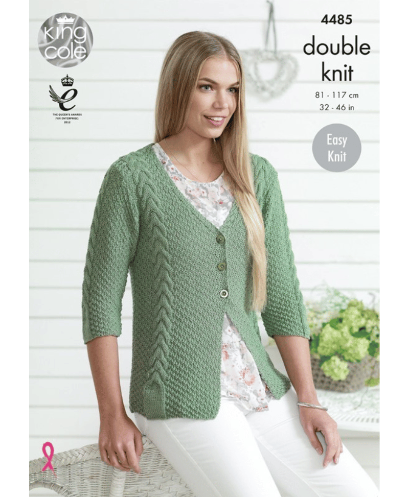 This v-neck cardigan and sweater are knit in King Cole Bamboo Cotton. Featuring 3/4 length sleeves and rich in texture thanks to the double moss stitch and cables.