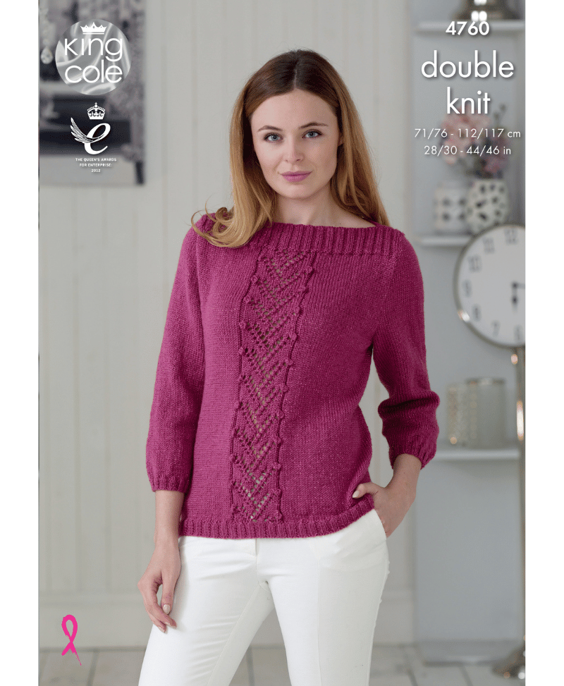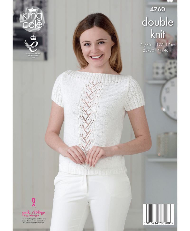 A lovely boat neck sweater and short sleeve top featuring a lace panel, knit in King Cole Glitz DK.