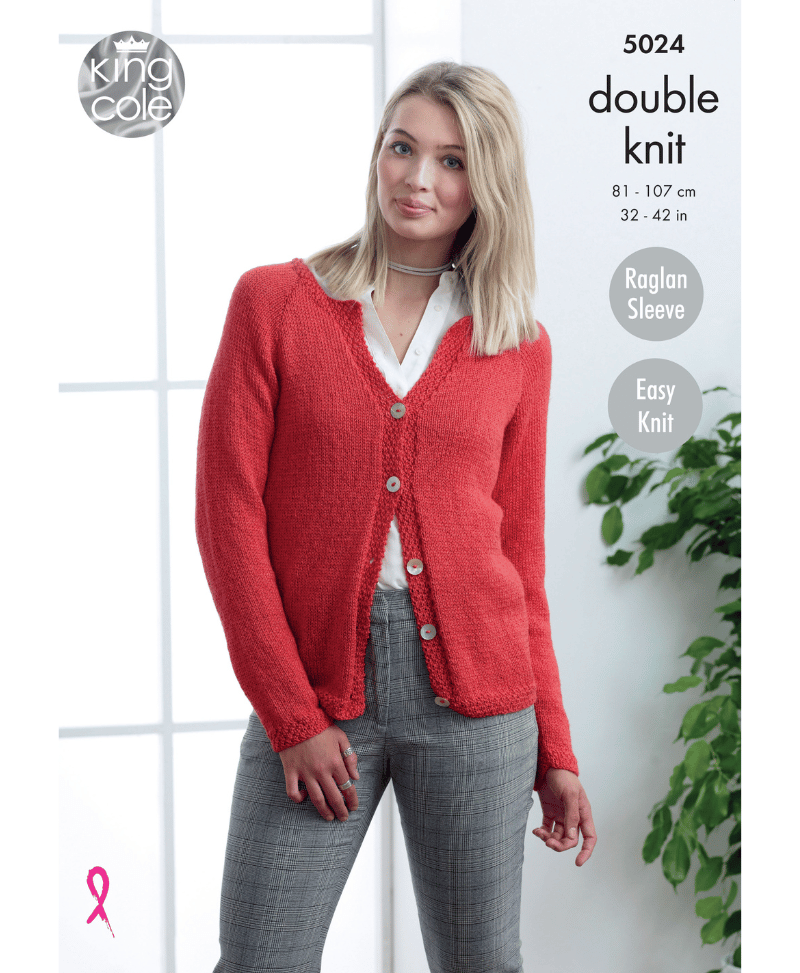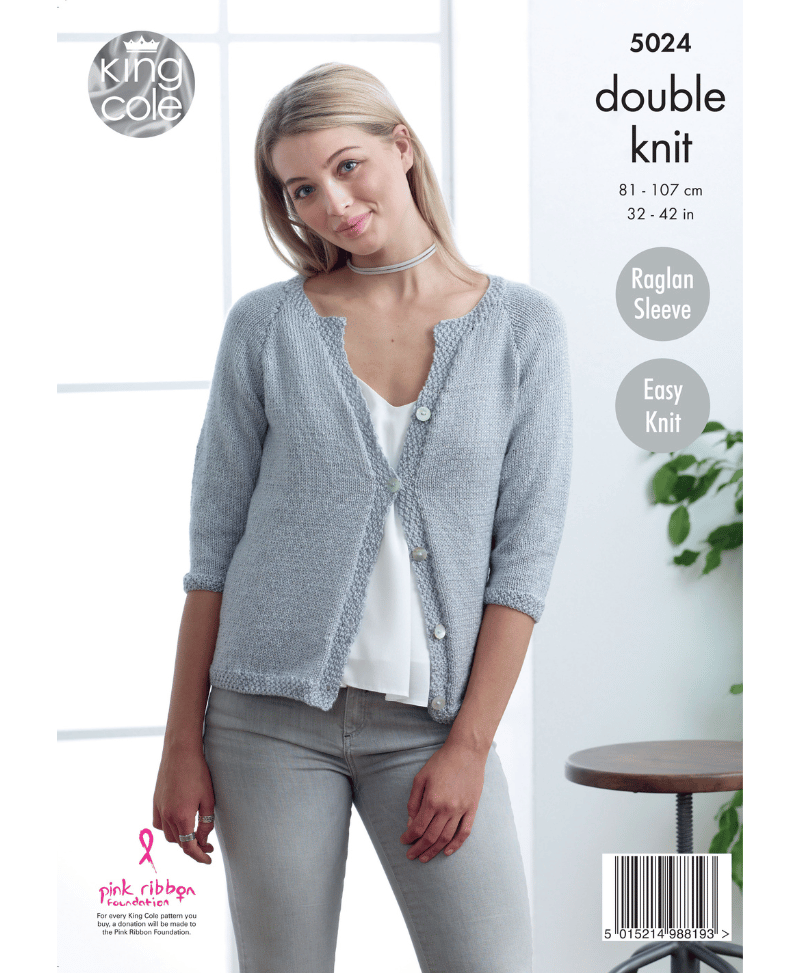 Choose between a long sleeve or 3/4 sleeve version of this easy knit round neck cardigan with raglan sleeves. Knit in King Cole Glitz DK, add some sparkle to your outfit.