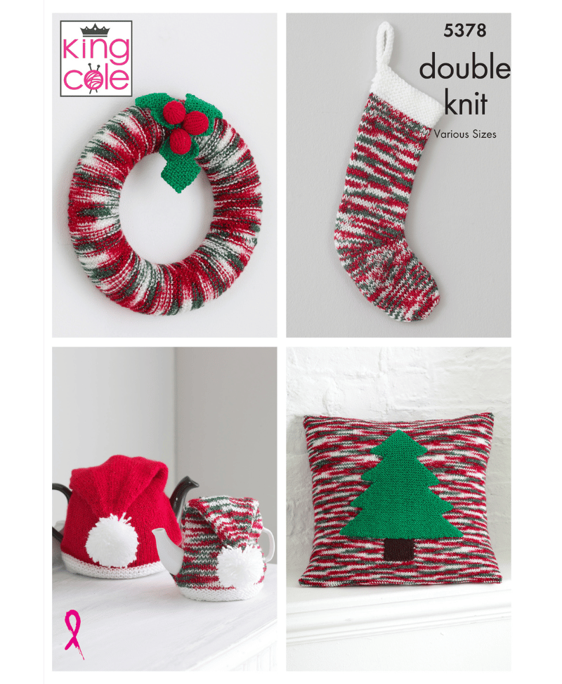Make your own Christmas accessories using King Cole Glitz DK. Choose from a wreath, stocking, cushion or tea cosie.