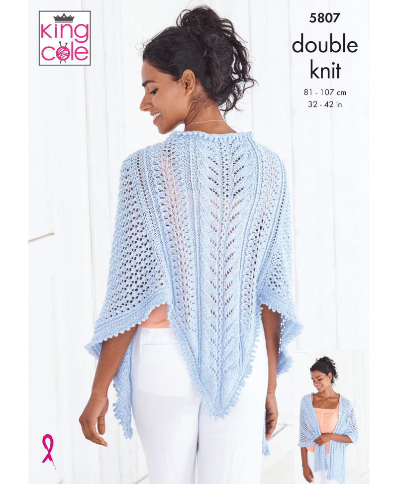 This lovely shawl and cardigan feature the same lace pattern. Knit in King Cole Glitz DK, add some sparkle to any outfit.
