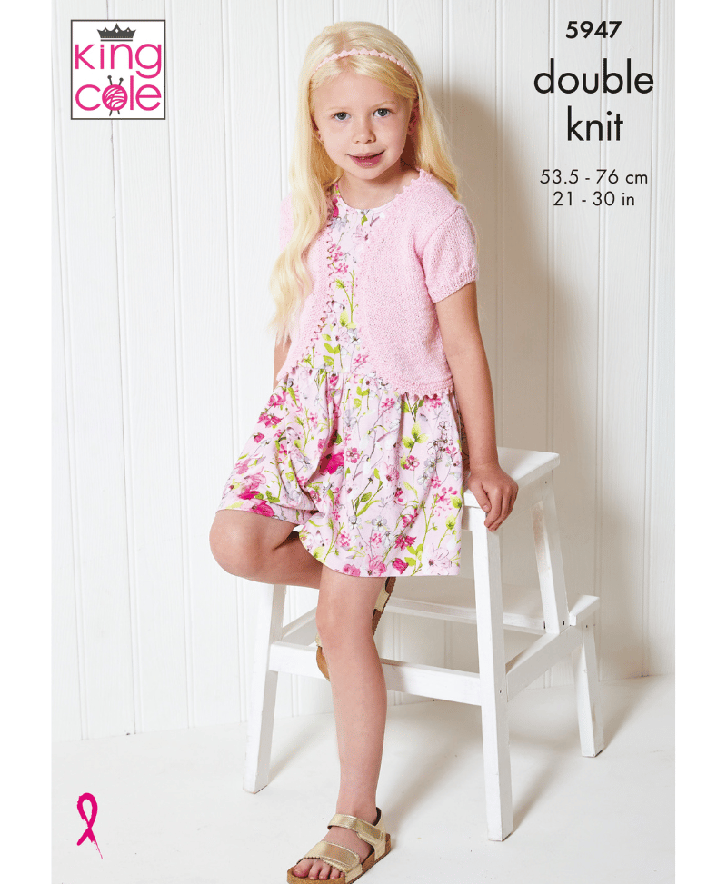 Little girls love a bit of sparkle and this bolero or vest top knit in King Cole Glitz DK is sure to delight them.