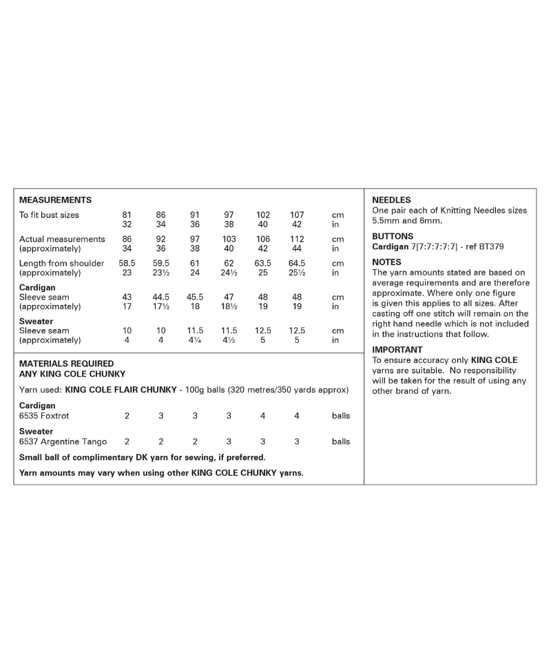 Choose between a sweater and a cardigan, perfect for layering as the weather turns cooler. Knit in King Cole Flair Chunky for sizes 32" - 42".