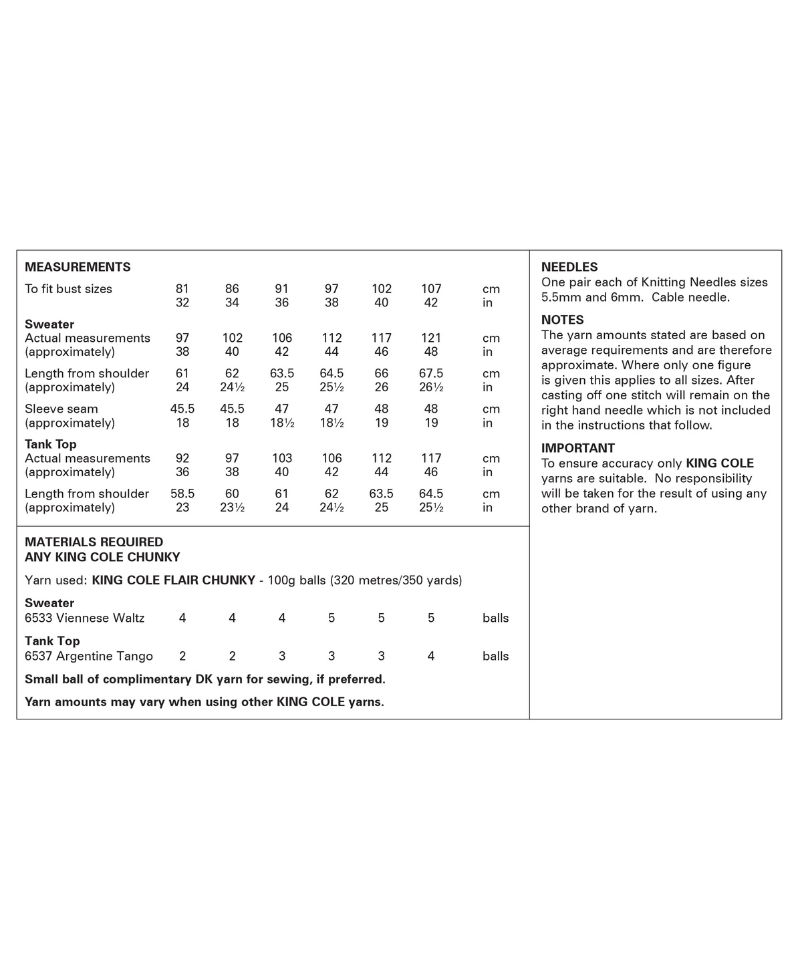 Choose between a tank top and a sweater, perfect for layering as the weather turns cooler. Knit in King Cole Flair Chunky for sizes 32" - 42".