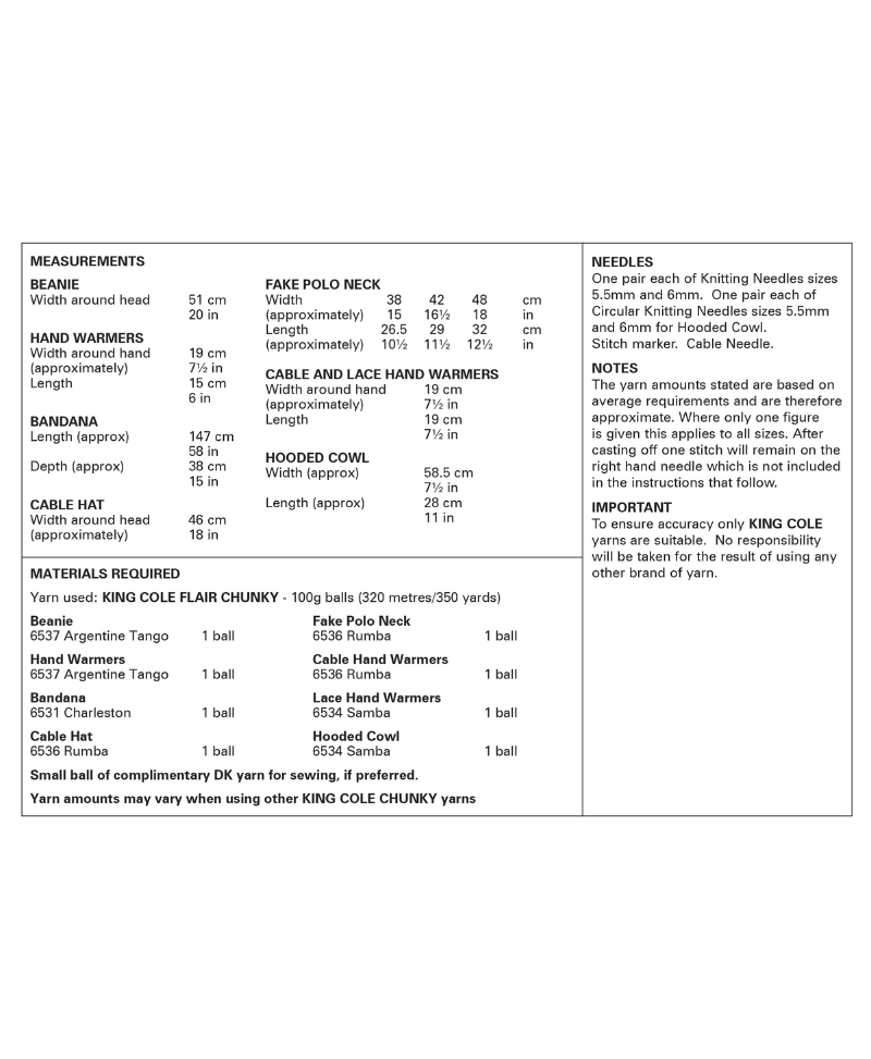 All of these accessories can be knit using just 1 ball each, of King Cole Flair Chunky.