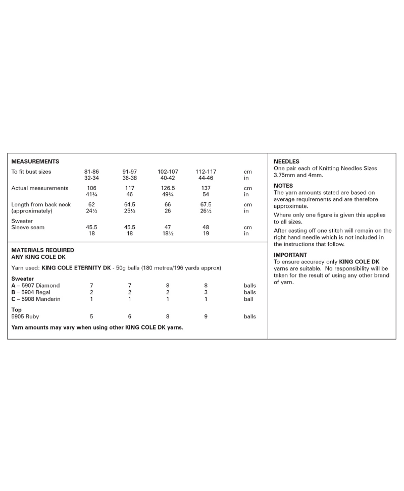 Choose between a beautiful sweater or an easy knit tank top which would be perfect for beginners, both of these are knit in King Cole's Eternity DK.