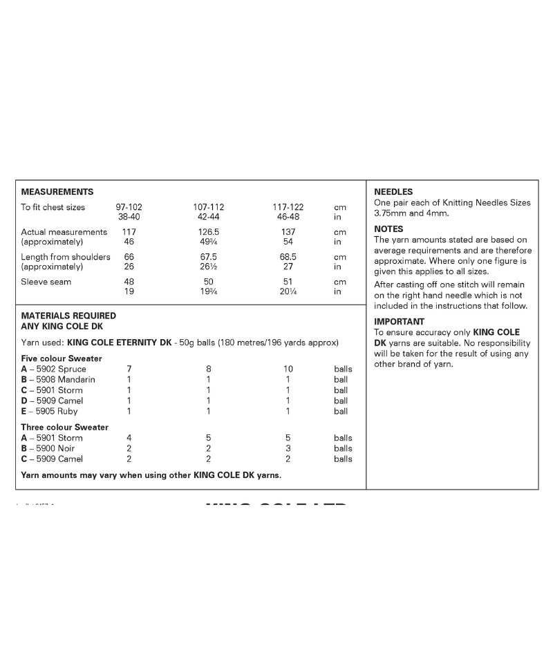 Two mens sweater designs, one featuring timeless classic stripes, the other features geometric shapes. Both are knit in King Cole Eternity DK.