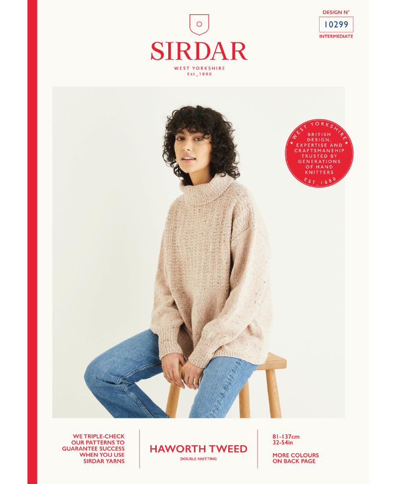 From Sirdar's British Heritage collection, start this over-sized roll neck sweater in Sirdar Haworth Tweed with simple ribs and stocking stitch then introduce a light chevron texture to the upper body with slip stitch. The ribbed roll neck has a relaxed fit so you'll be cosy and comfy all winter.
