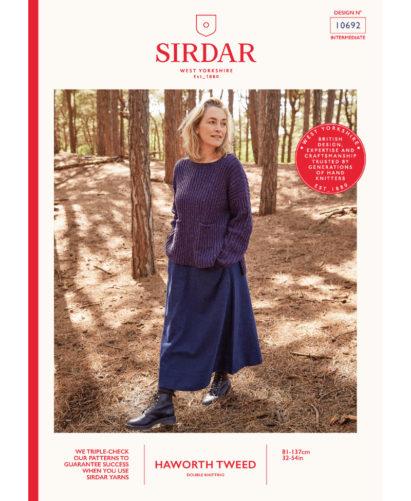 Cosy up with the Shoreline Sweater from Sirdar's Coast & Country collection. The relaxed shape, stepped hem and invisible front pockets make this ribbed sweater in Sirdar Haworth Tweed perfect for country walks. The knitting pattern features increasing at the front sides creating a cut-away effect to the stepped hem.