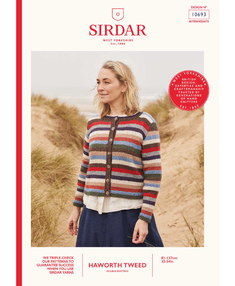 The Coast & Country Cardigan from the Coast & Country collection has Sirdar's British home knitted into every stripe. Each of the nine Haworth Tweed yarn shades in this classic round-neck cardigan knitting pattern are named to honour Yorkshire people and places. The knitting pattern instructions include fully-fashioned shaping and neat set-in sleeves to create a neat fit.