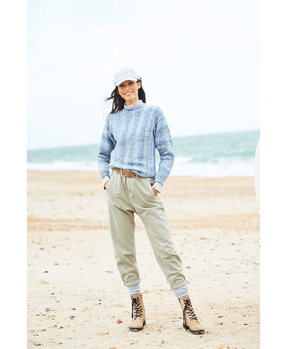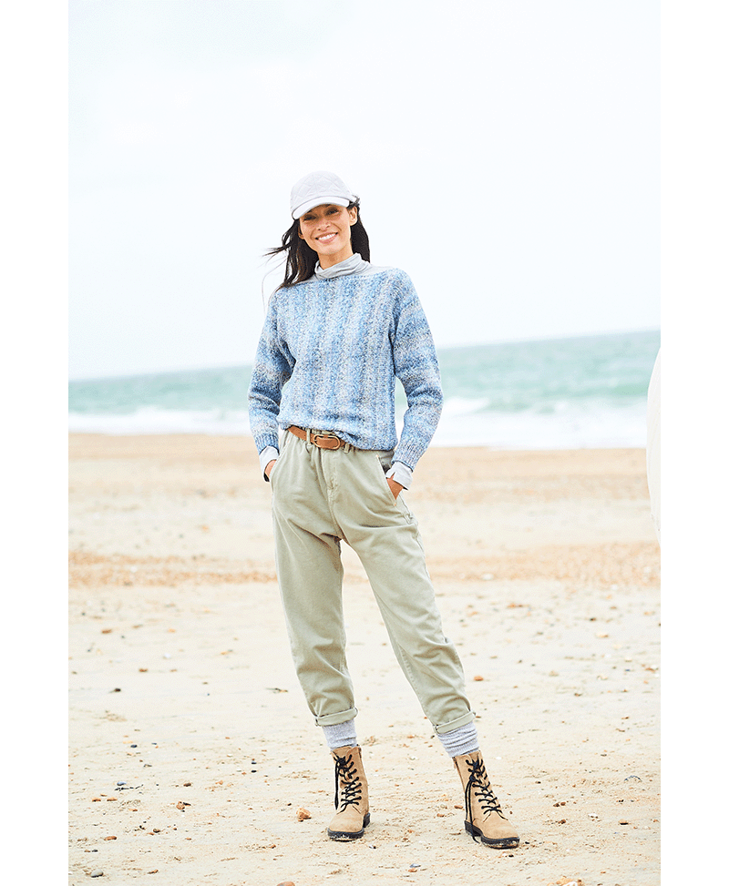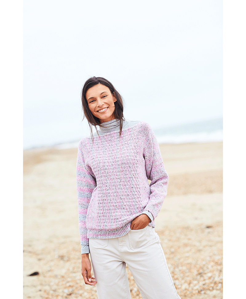 Both of these sweaters are knitted sideways and have boat necks for a modern and cool style. One has a subtle texture down the front, whereas the other is plain stocking stitch.