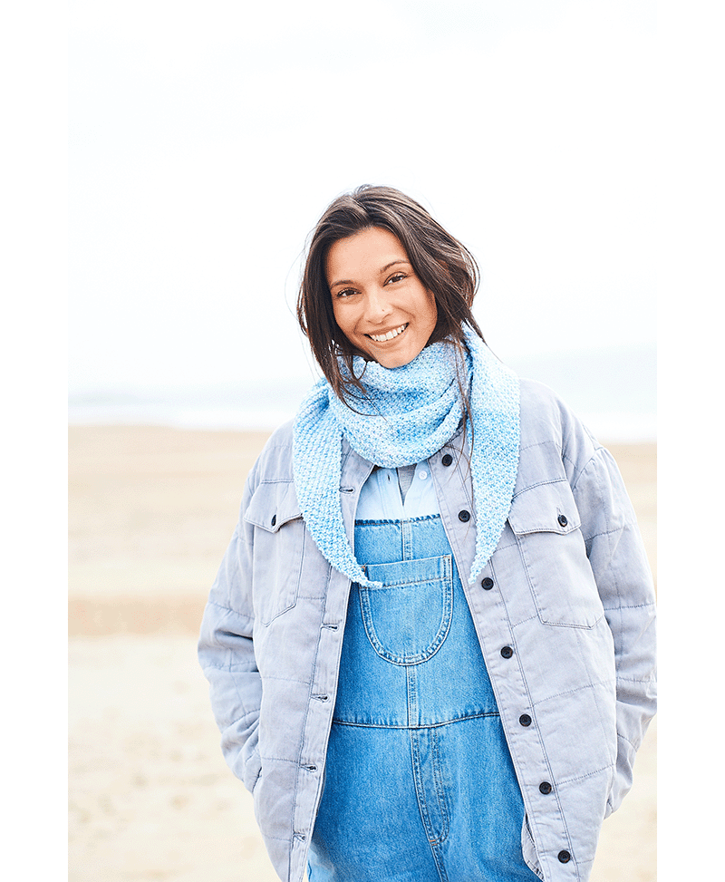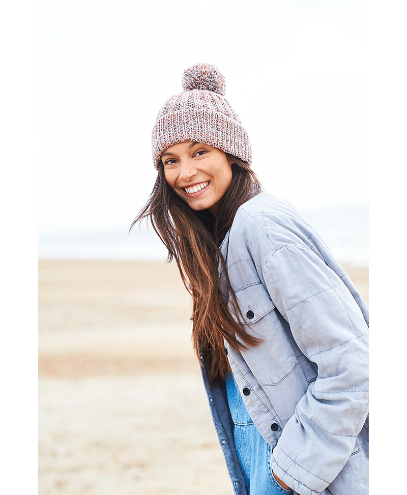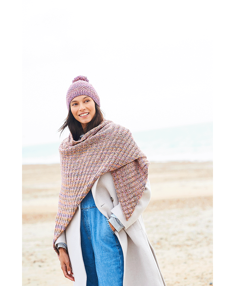 No collection is complete without accessories. We have a pompom hat, shawl and a scarf. The hat features a deep turnover and the shawl is big enough to wrap up in, which is a must have feature of a shawl, we think!
