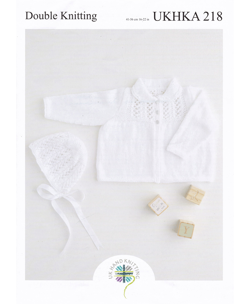 UKHKA 218 UK Hand Knit Assoc. Double Knitting Matinee Jacket and Bonnet